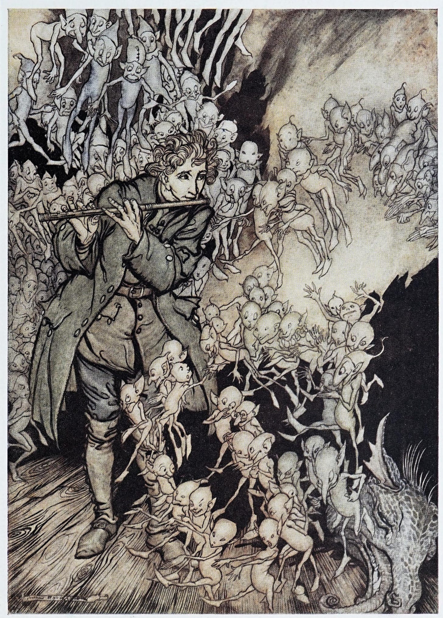 Being lost in the dark, our tale suggests, though it is certainly disorienting, allows for a deeper wisdom to make itself known. At his worst moment, when his brothers have made off with the princesses and he is wandering alone deep in the earth, Stupid Hans is rescued, not by his own cleverness, but by his acceptance of the unfamiliar and his attunement to the life of the depths. At first, Hans “wears the ground smooth,” walking back and forth and worrying about his situation. But then, as we read in the story, “he began to think of other things.” At this point, Hans takes down a flute that is hanging on the wall and begins to play a tune.